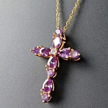 Purple Crystal Amethyst Gemstones Cross Pendant Necklaces for Women 18k Gold Filled Fine Jewelry Choker Gifts Trendy Accessory