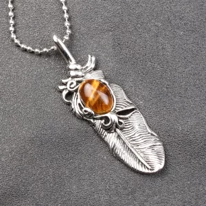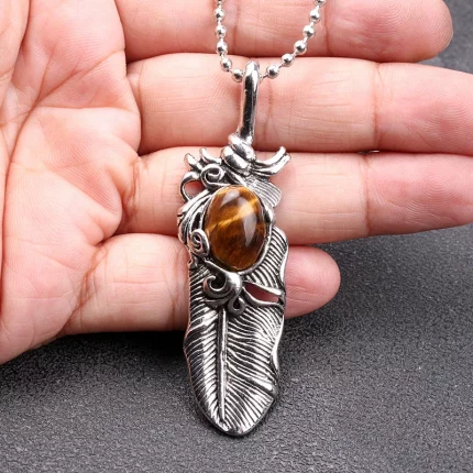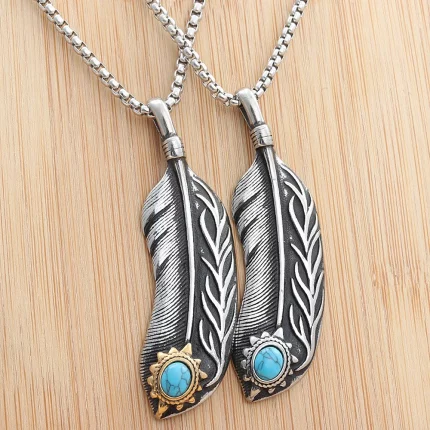 Vintage Stainless Steel Feather Necklace For Men Women Punk Biker Feather Green Stone Pendant Necklaces Fashion Jewelry Gifts