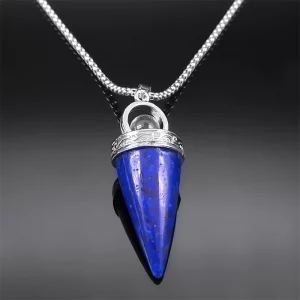 Witch Ball Conical Blue Lapis Lazuli Stone Pendant Necklace Women Men Stainless Steel Wicca Pagan Chain Jewelry colier NZZZ372-1