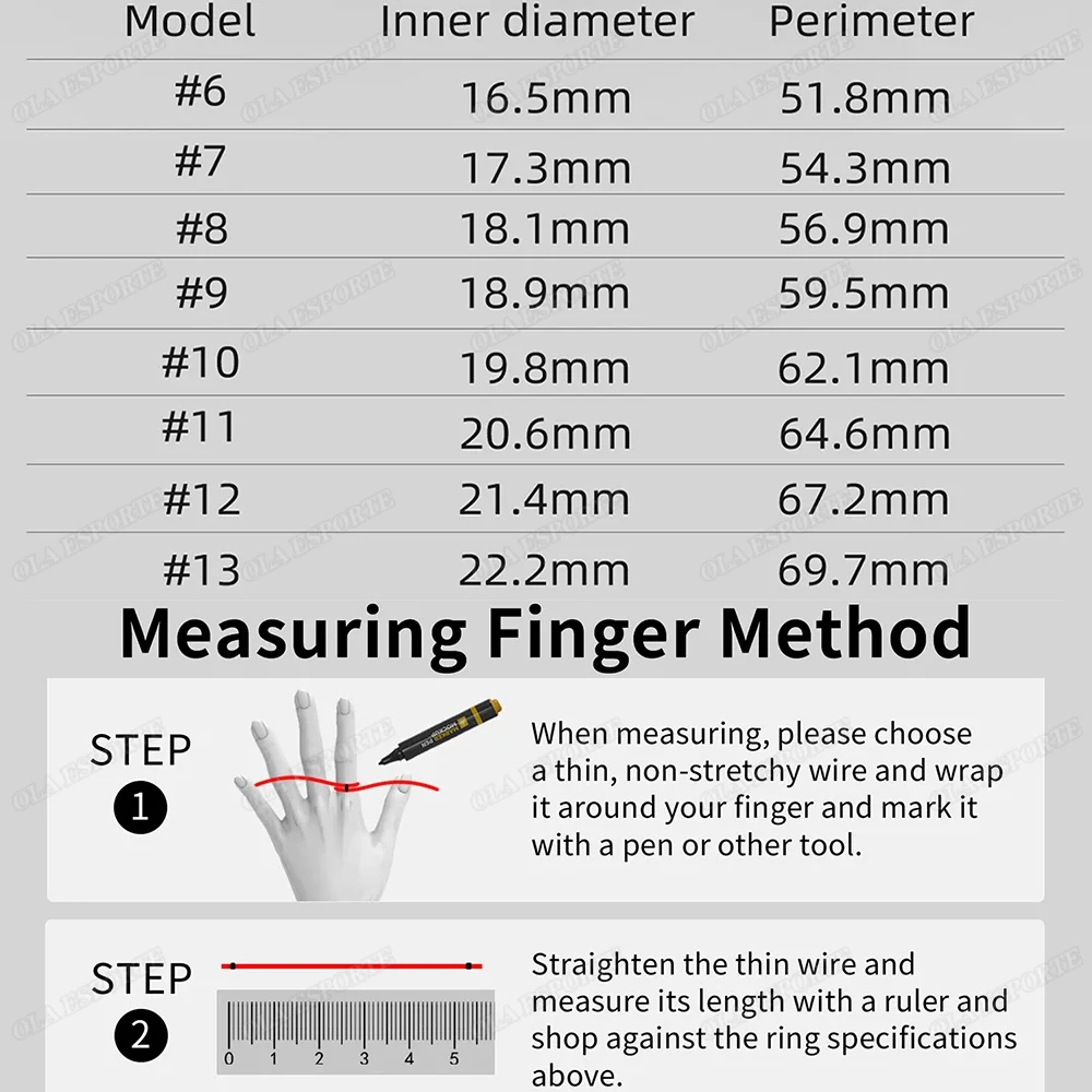 Ring Internal Diameter(mm):6#16.5mm,7#17.3mm, 8#18.1mm, 9#18.9mm, 10#19.8mm,11#20.6mm, 12#21.4mm、13#22.2mm