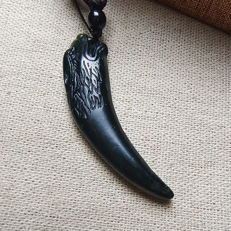An authentic black jade domineering peak pendant, men’s dark green jade double-sided dragon tooth necklace.