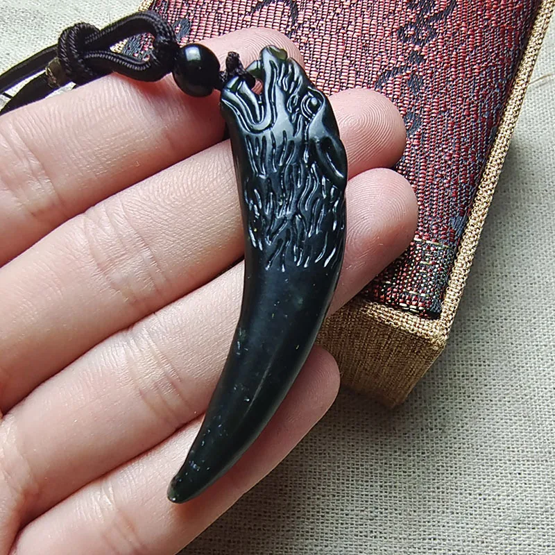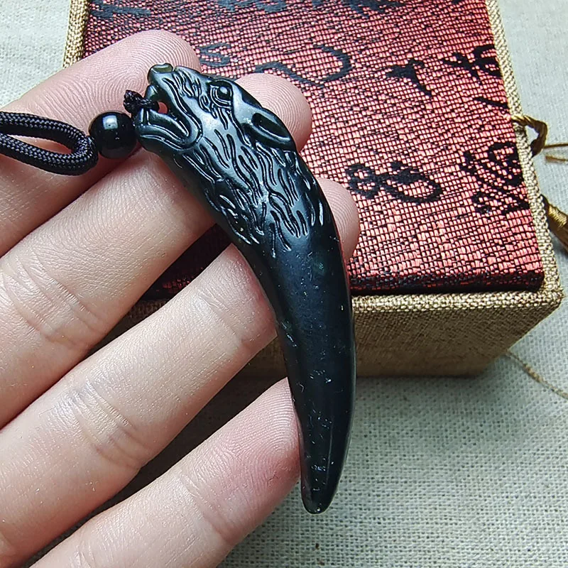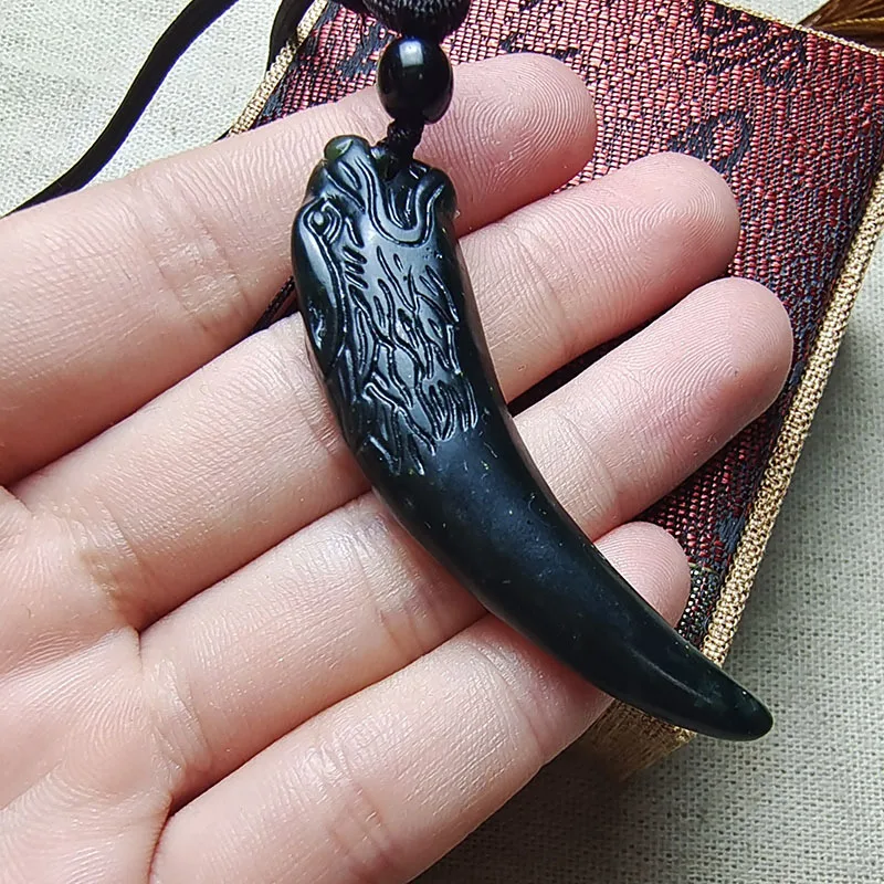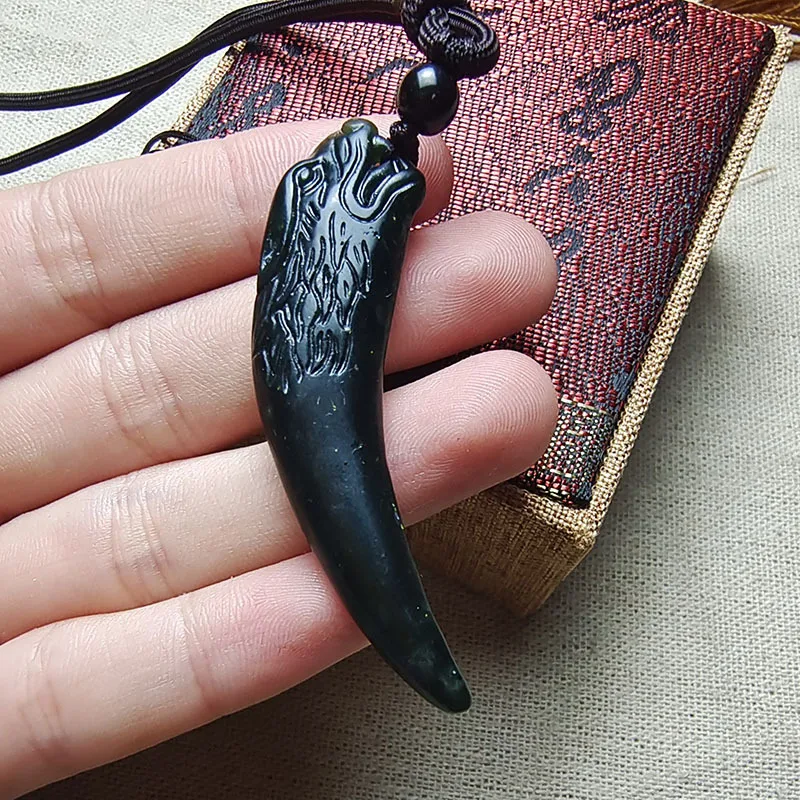 An authentic black jade domineering peak pendant, men’s dark green jade double-sided dragon tooth necklace.
