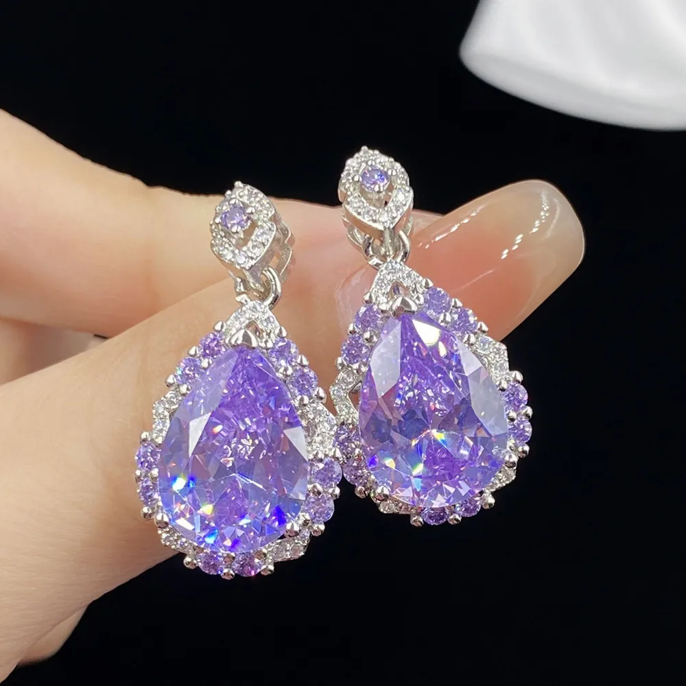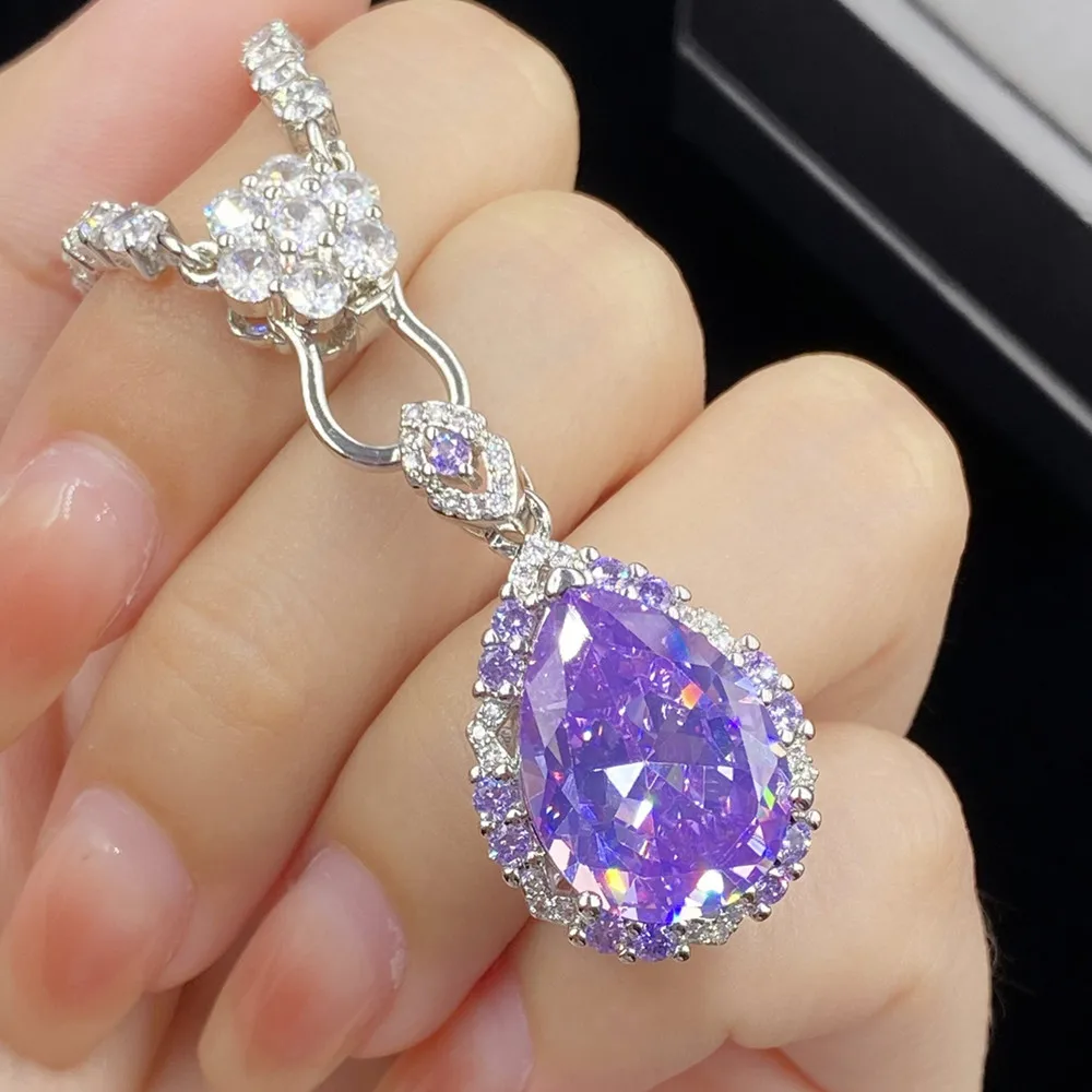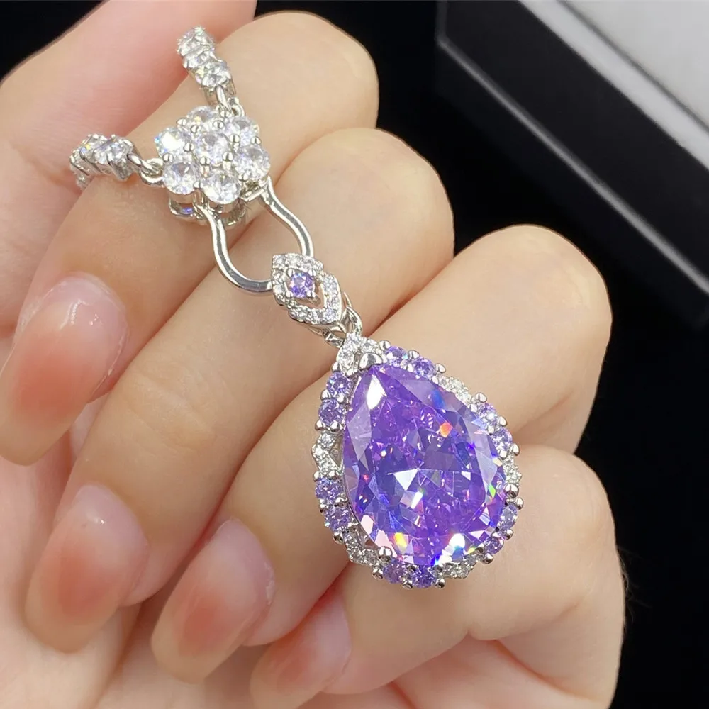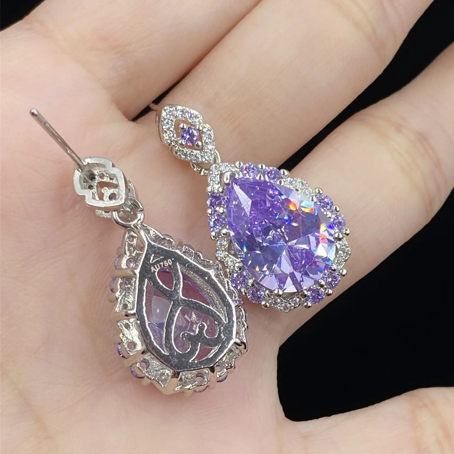 Brilliant Cutting Purple Amethyst Gemstones Diamonds Water Drop Pendant Necklace Woman Evening Party Fine Jewelry Sets Gifts