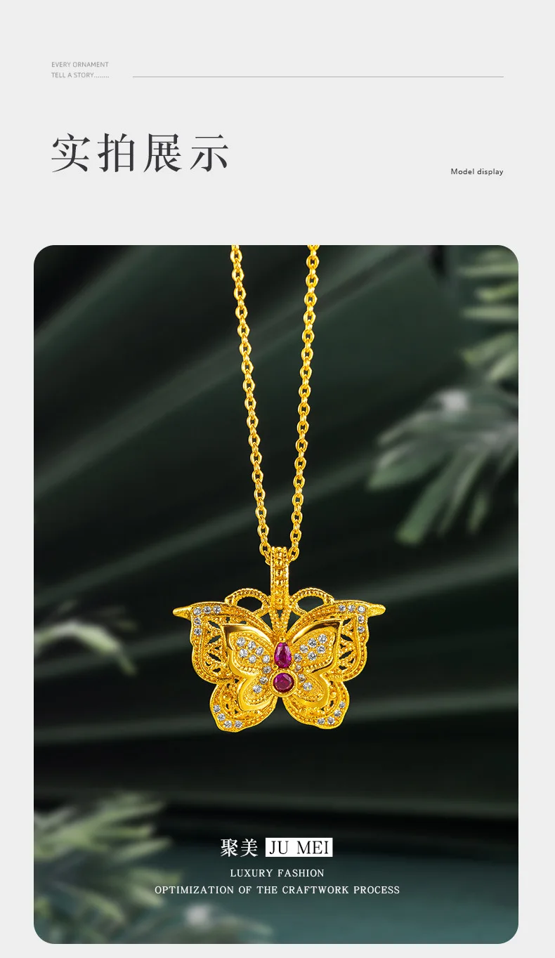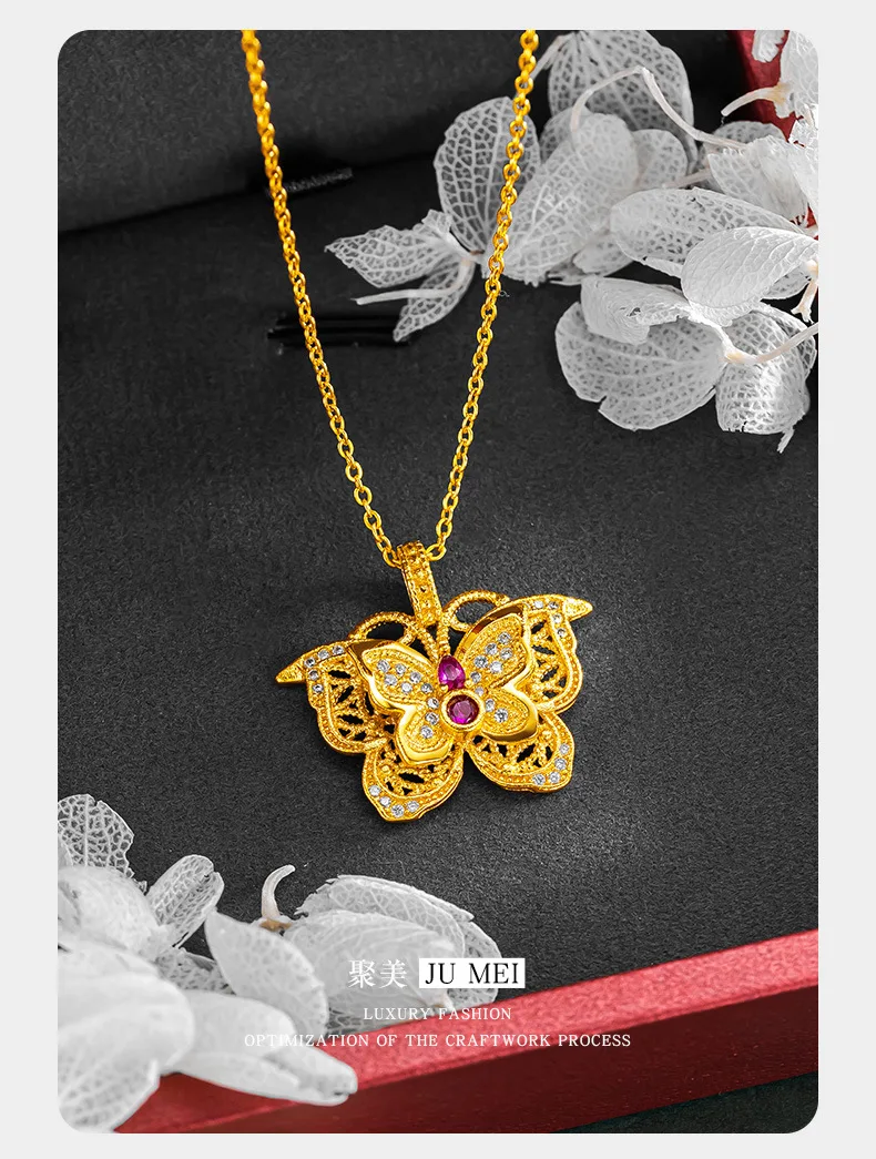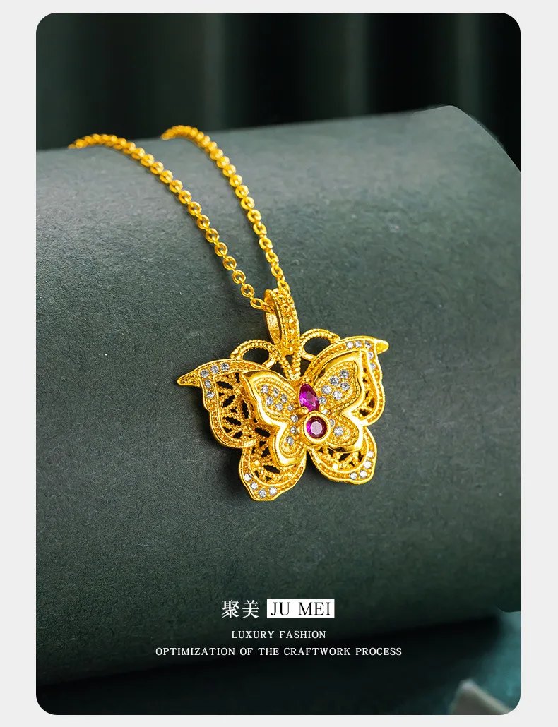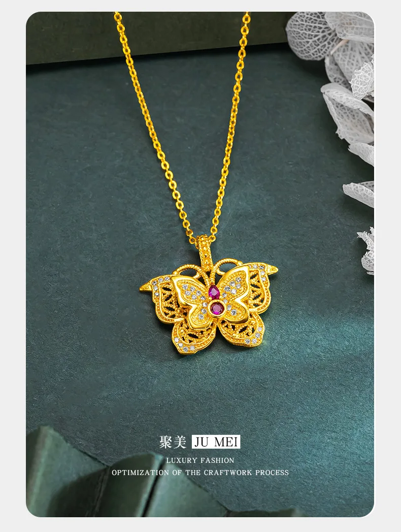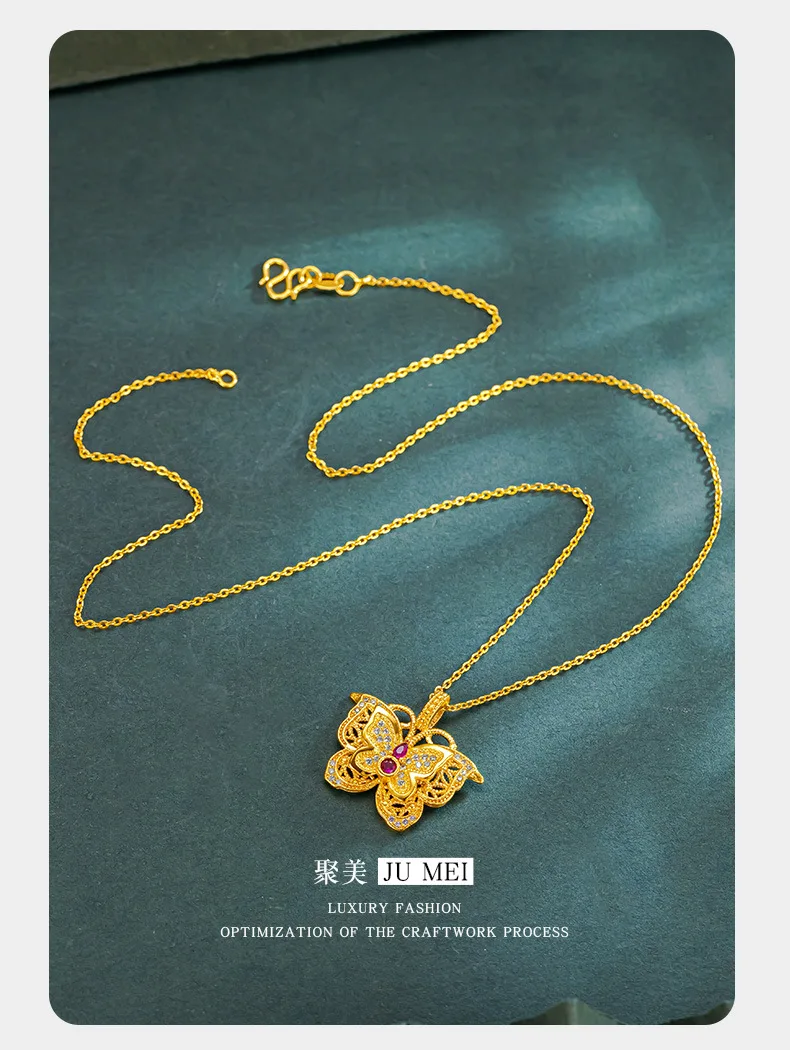 Luxury 24K 9999 Pure Gold real gold Silk Hollow Ruby Butterfly Pendant Butterfly Necklace Women’s Clavicle Chain
