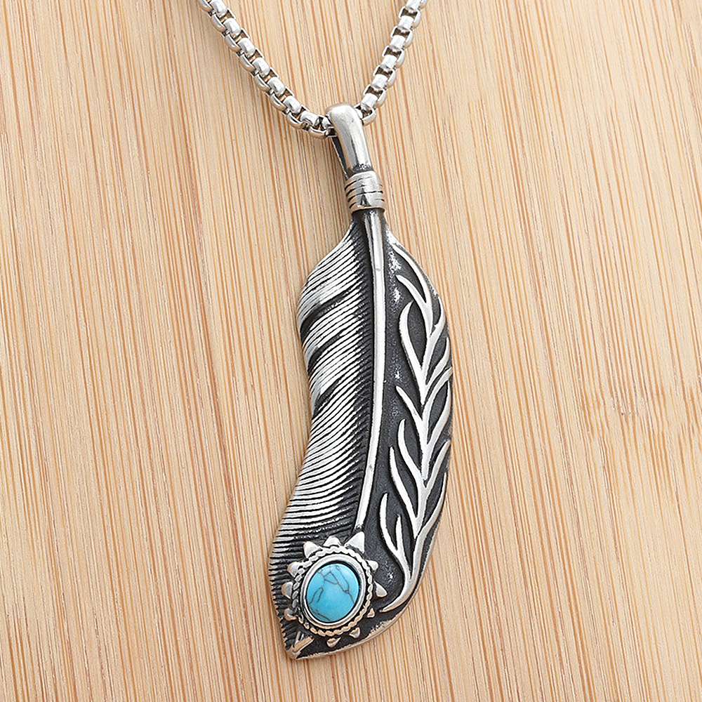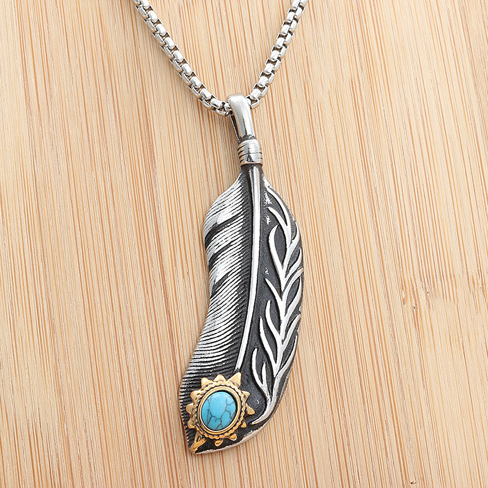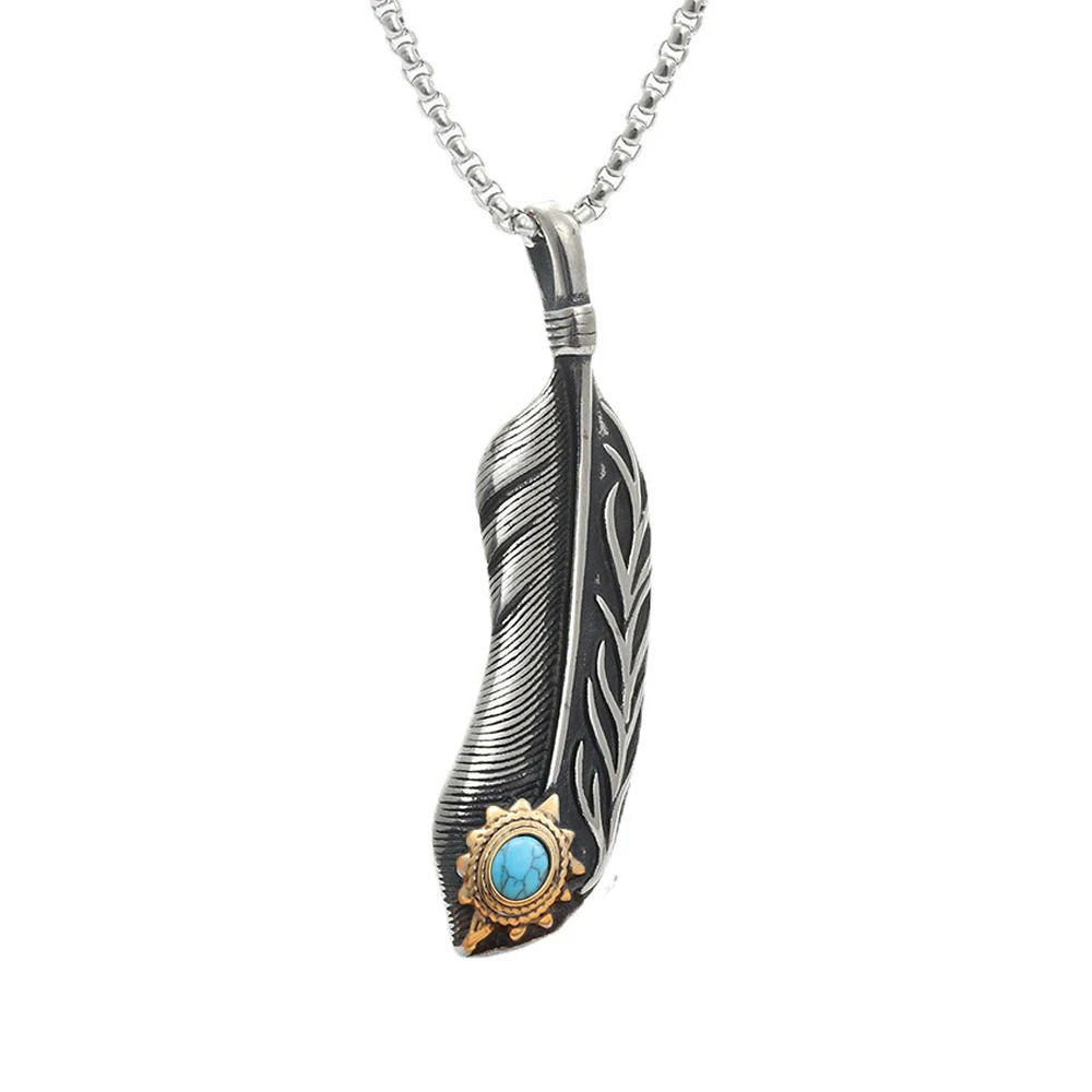 Vintage Stainless Steel Feather Necklace For Men Women Punk Biker Feather Green Stone Pendant Necklaces Fashion Jewelry Gifts