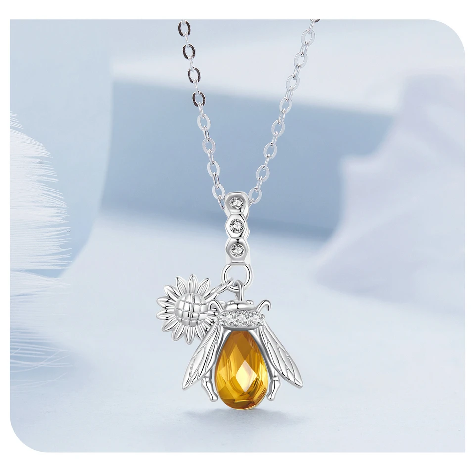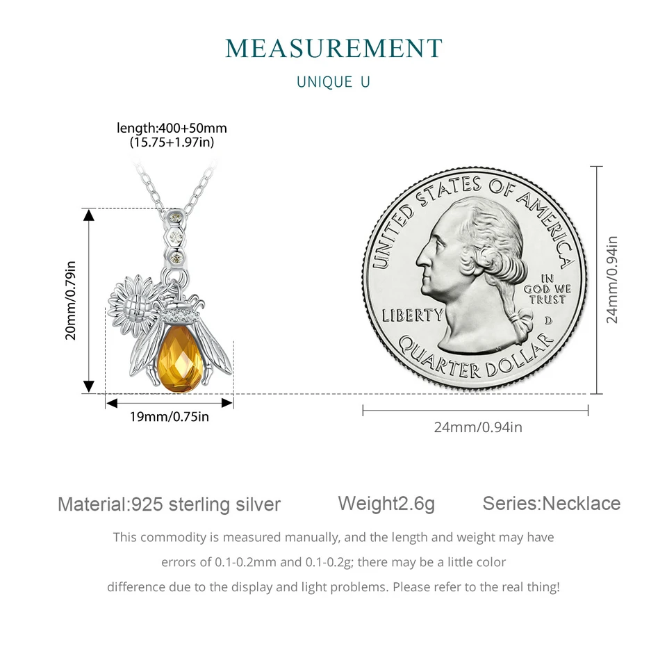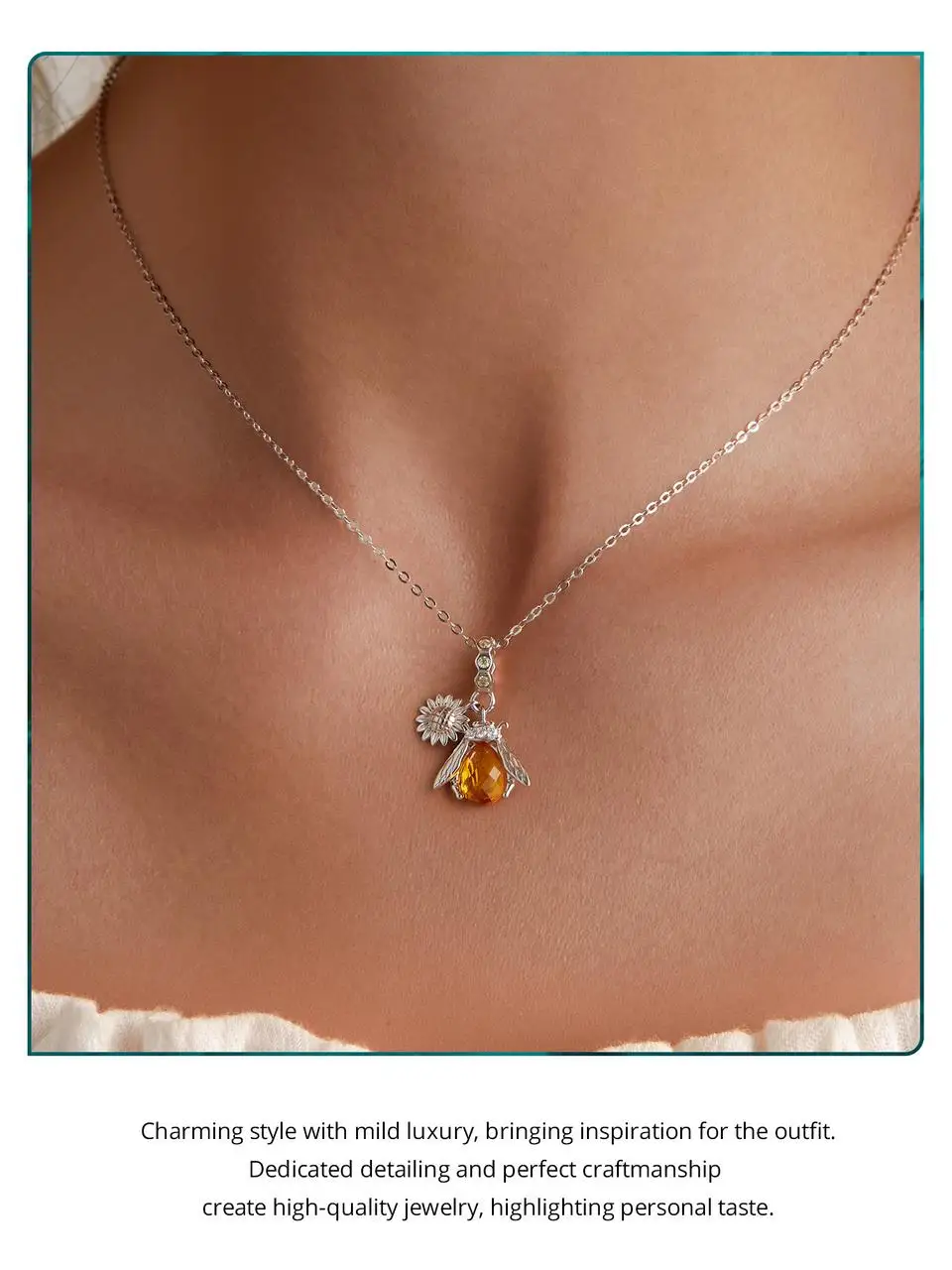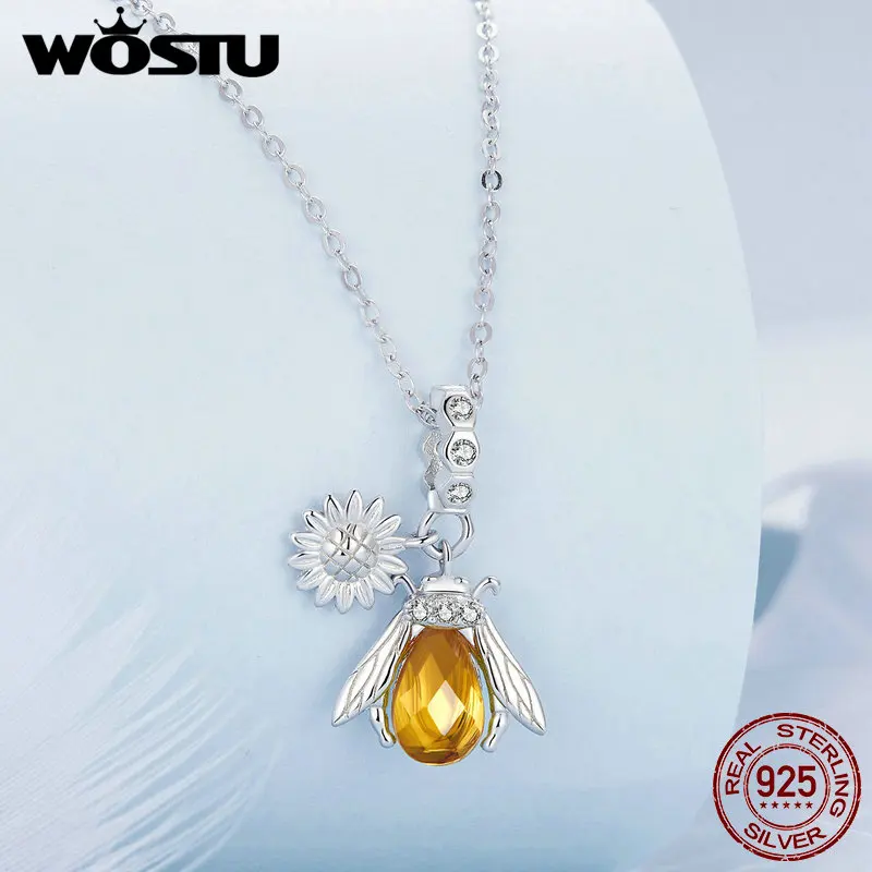 WOSTU Real 925 Sterling Brazil Citrine Crystal Honeybee Daisy Pendant Necklace For Women Wedding Party Bridal Gift Wholesale